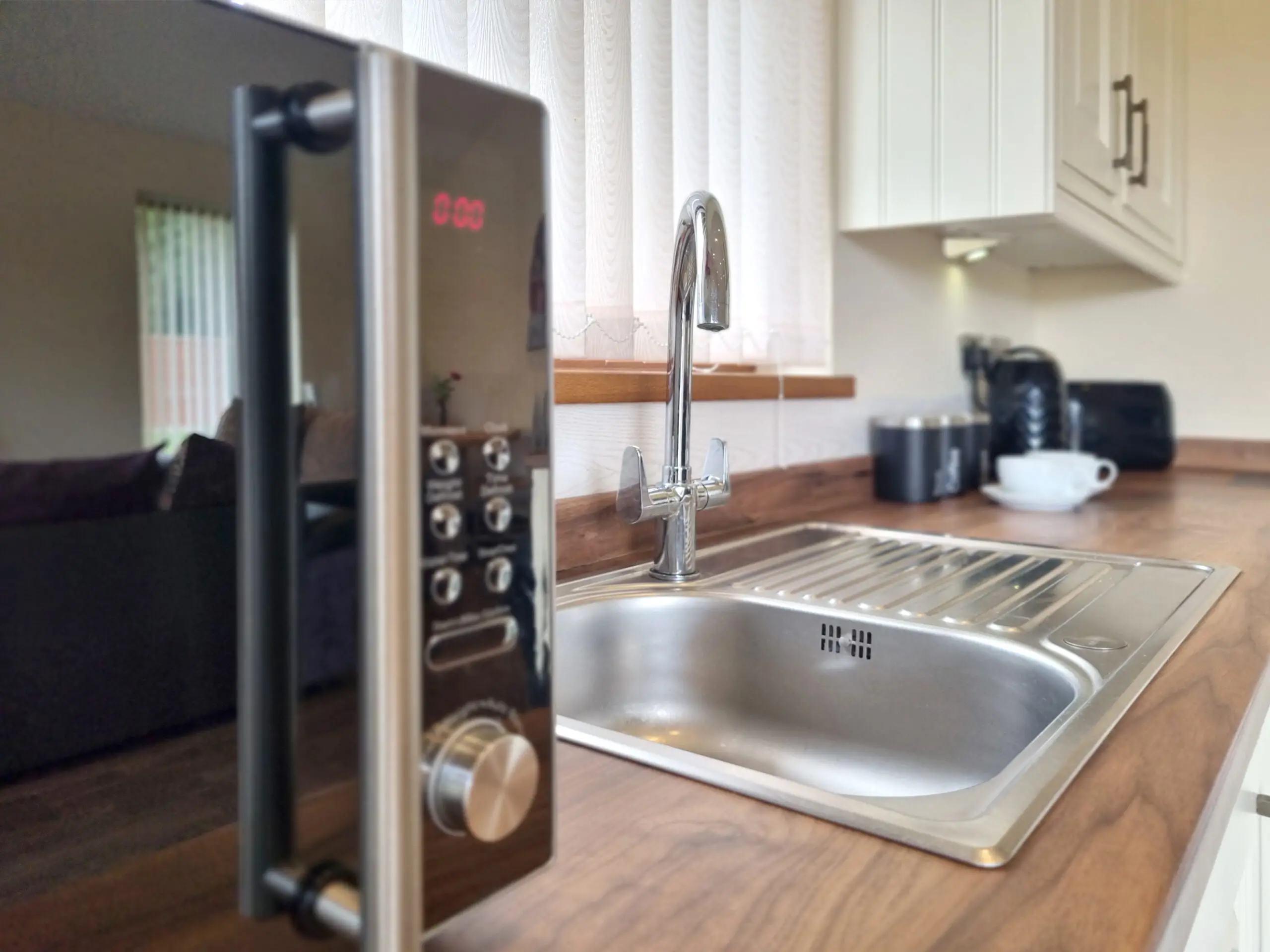 Luxury one bedroom lodge, with a super king size bed and bathroom. Fully equipped kitchen with open living/Dining space. Outside seating area and Private Outdoor Hot Tub which has access straight from bedroom.