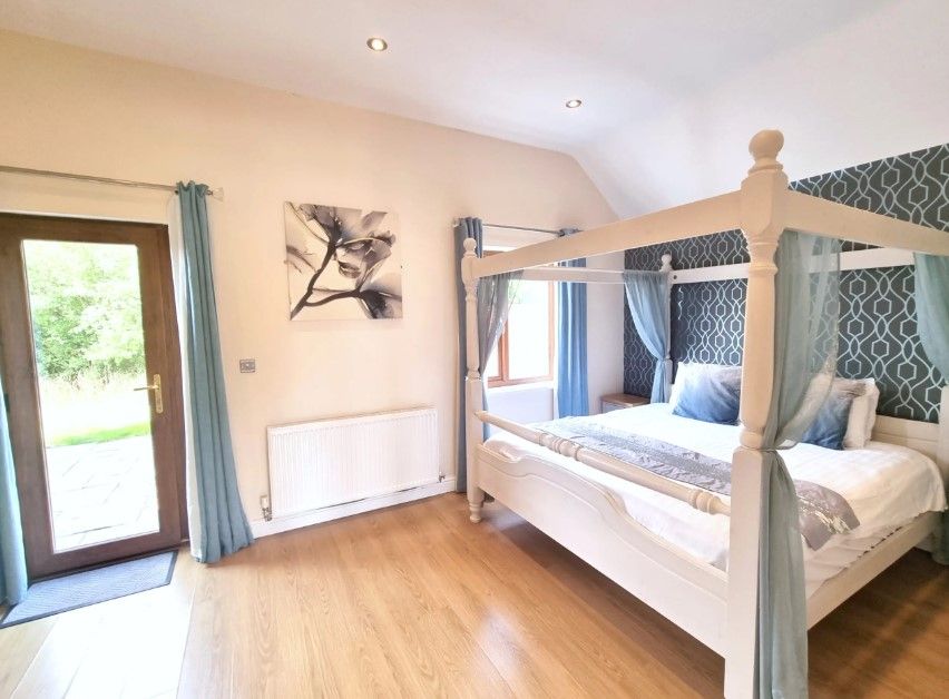 Luxury one bedroom lodge, with a super king size four poster bed and en-suite bathroom. Fully equipped kitchen with open living/Dining space. Outside seating area and Private Outdoor Hot Tub which has access straight from bedroom.